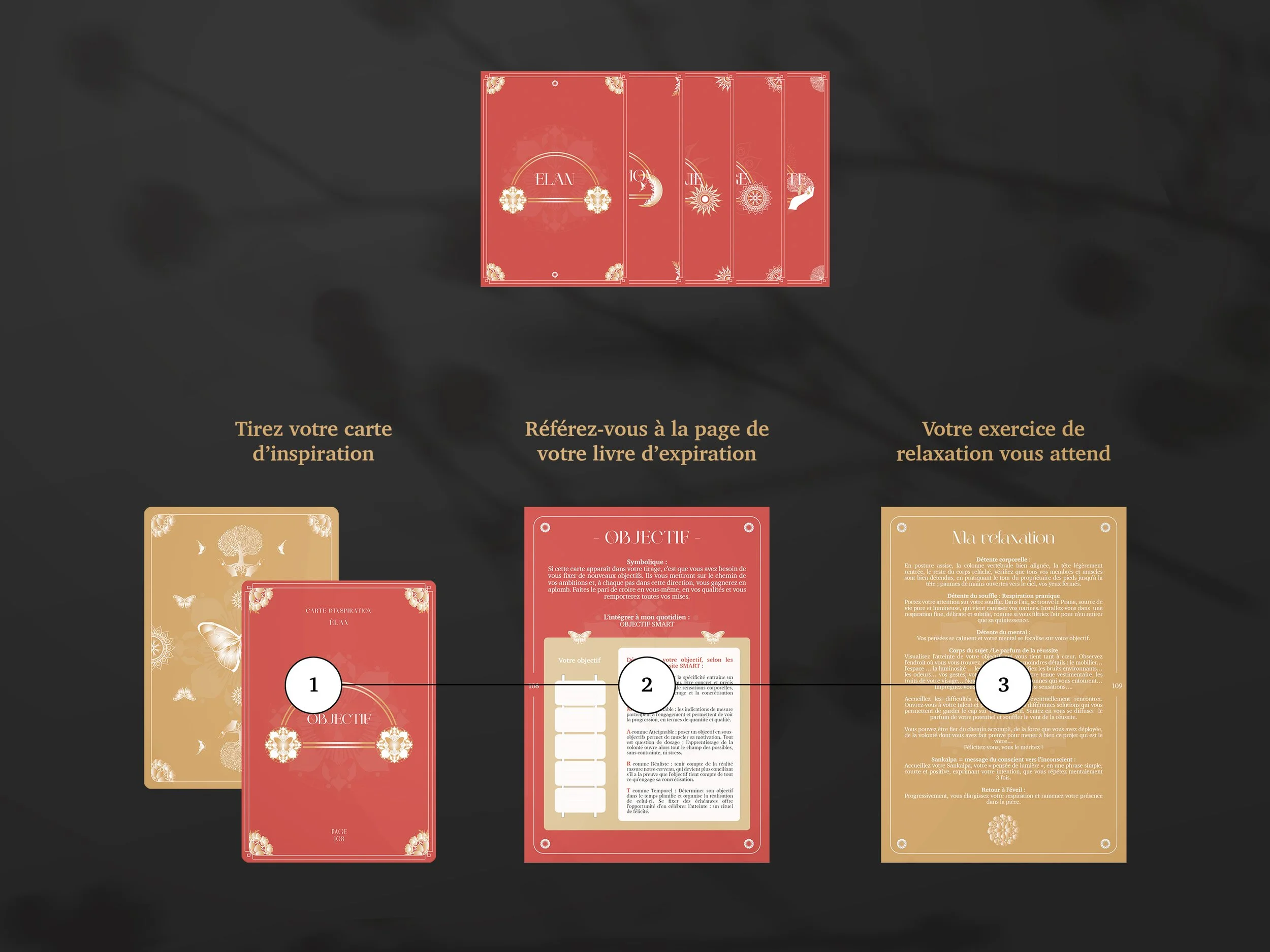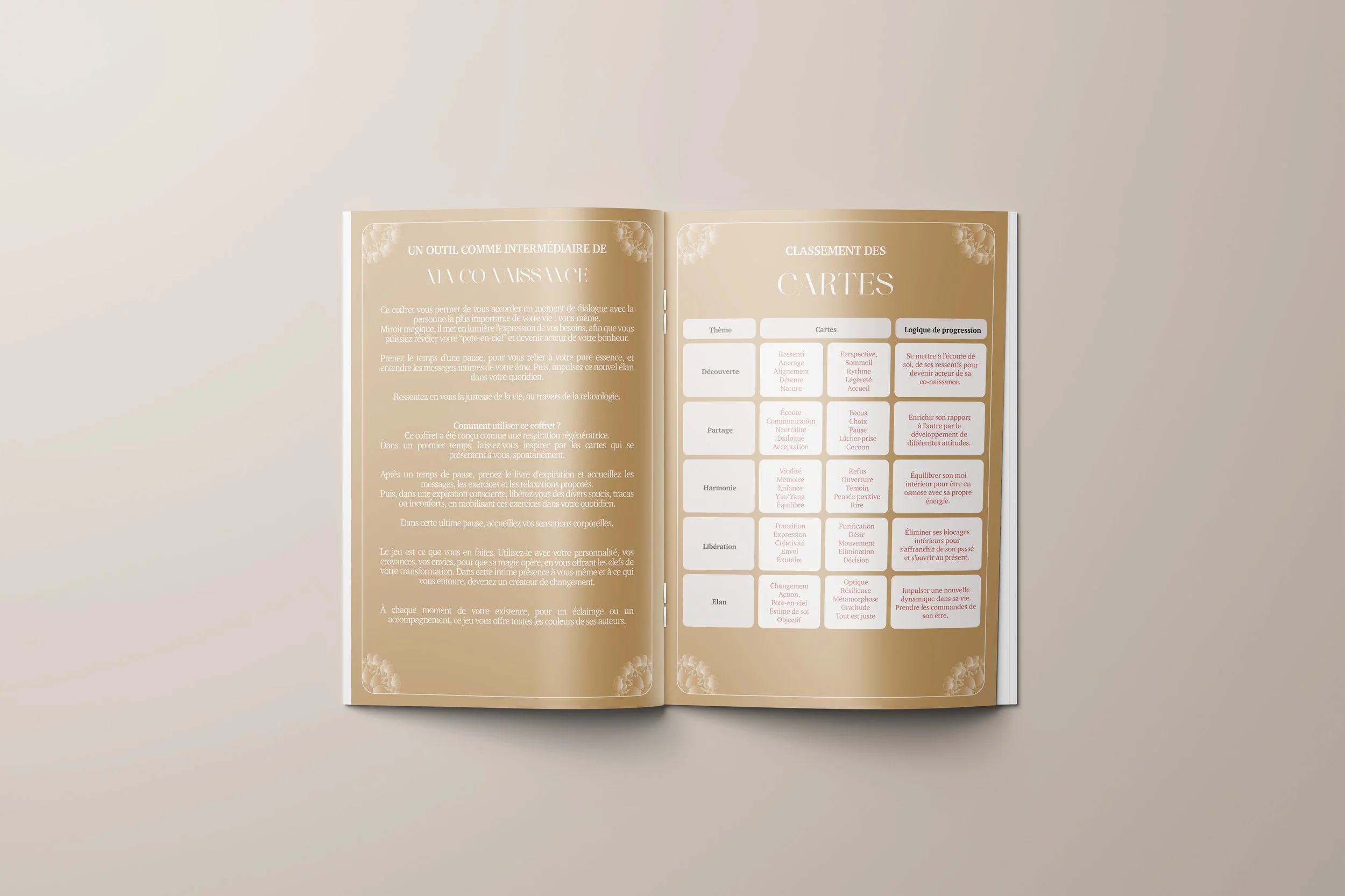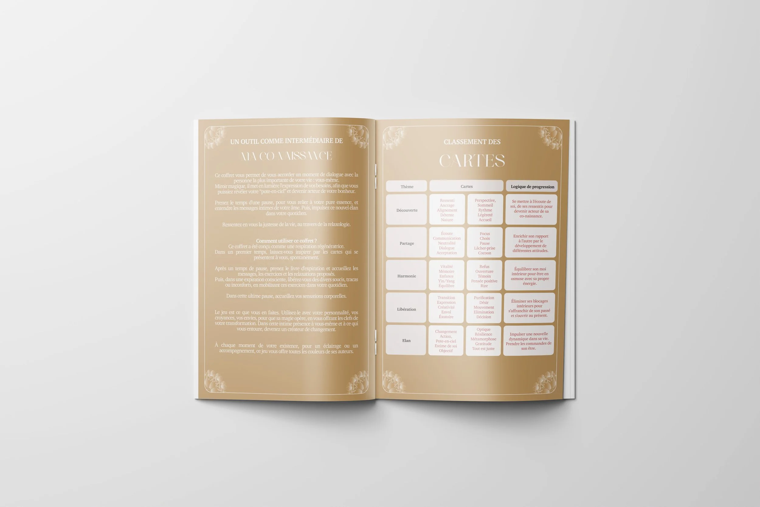 Vous trouverez dans son contenu votre jeu de cartes avec ses 5 thèmes et son livre d’expiration qui sera votre guide dans votre découverte et votre pratique dans le monde de la Relaxologie.